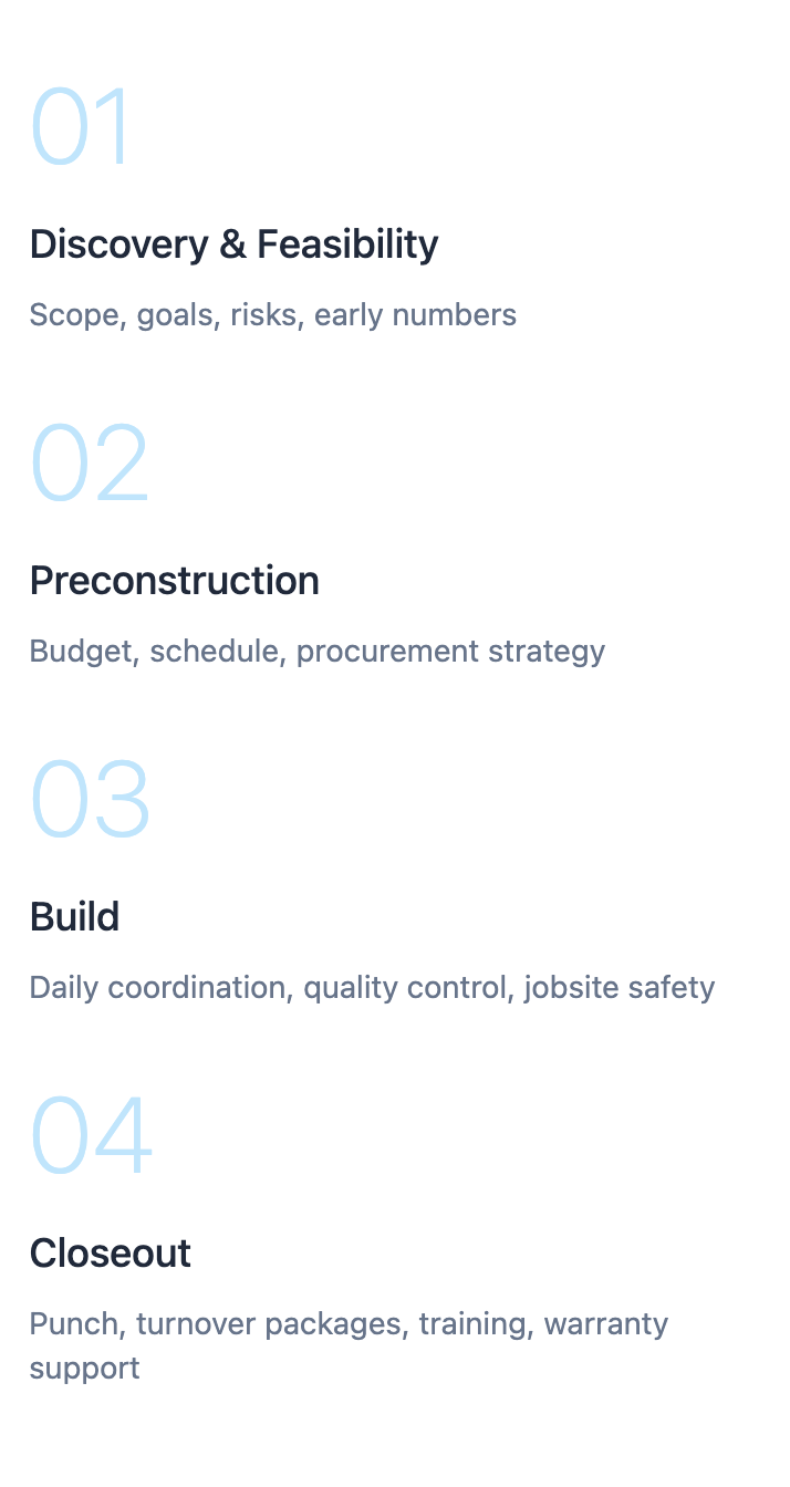 We believe the best results stem from a partnership between the Client, the Architect, and the Construction Manager. This collaborative approach ensures that design and budget stay in lockstep, drastically shortening the timeline for critical decision-making.